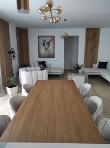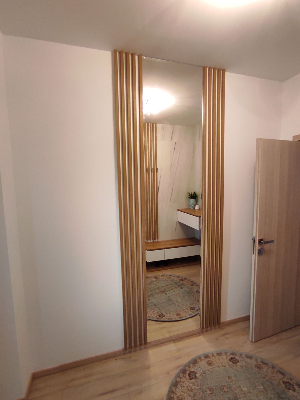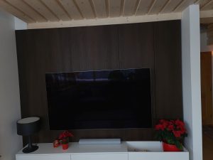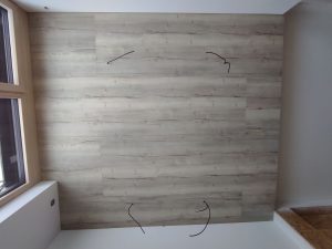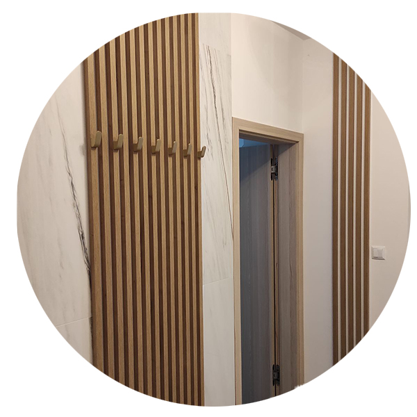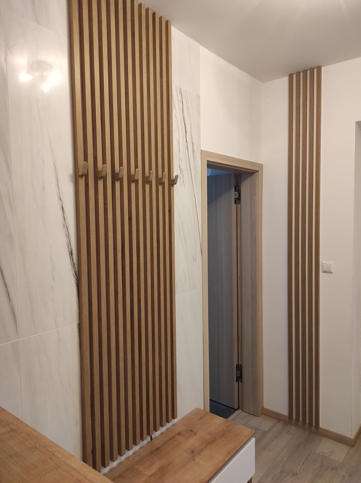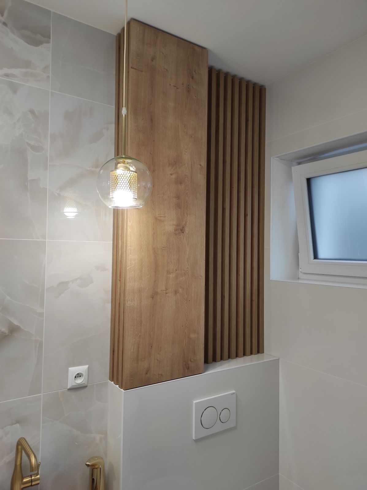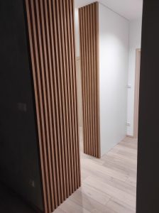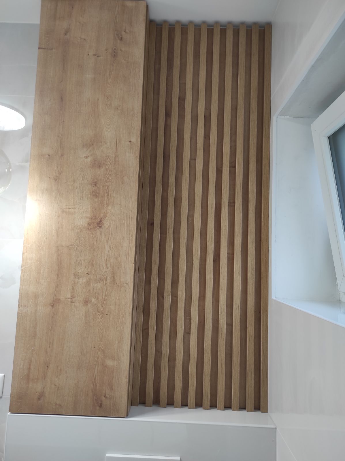 Obklad častí stien hranolčakmi z drevotriesky v dekore podľa výberu, zhodnom podľa ostatného nábytku