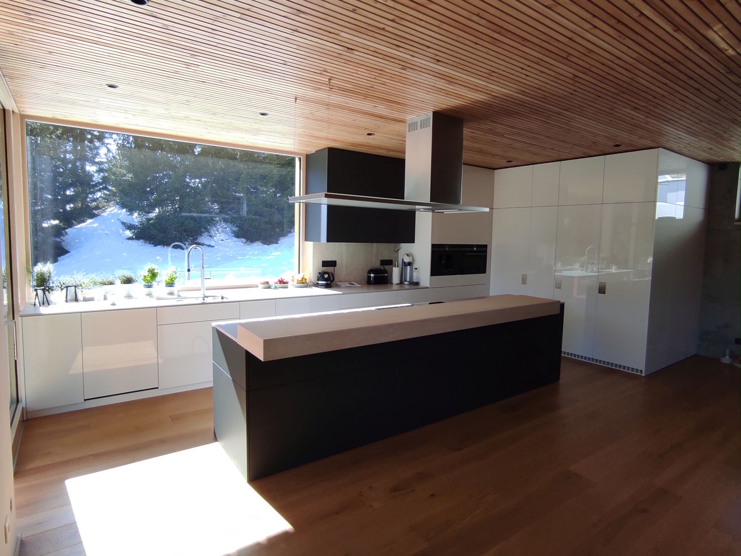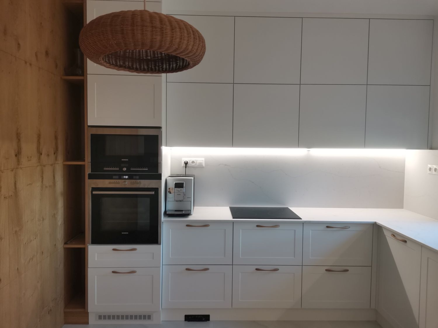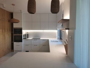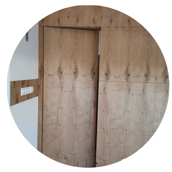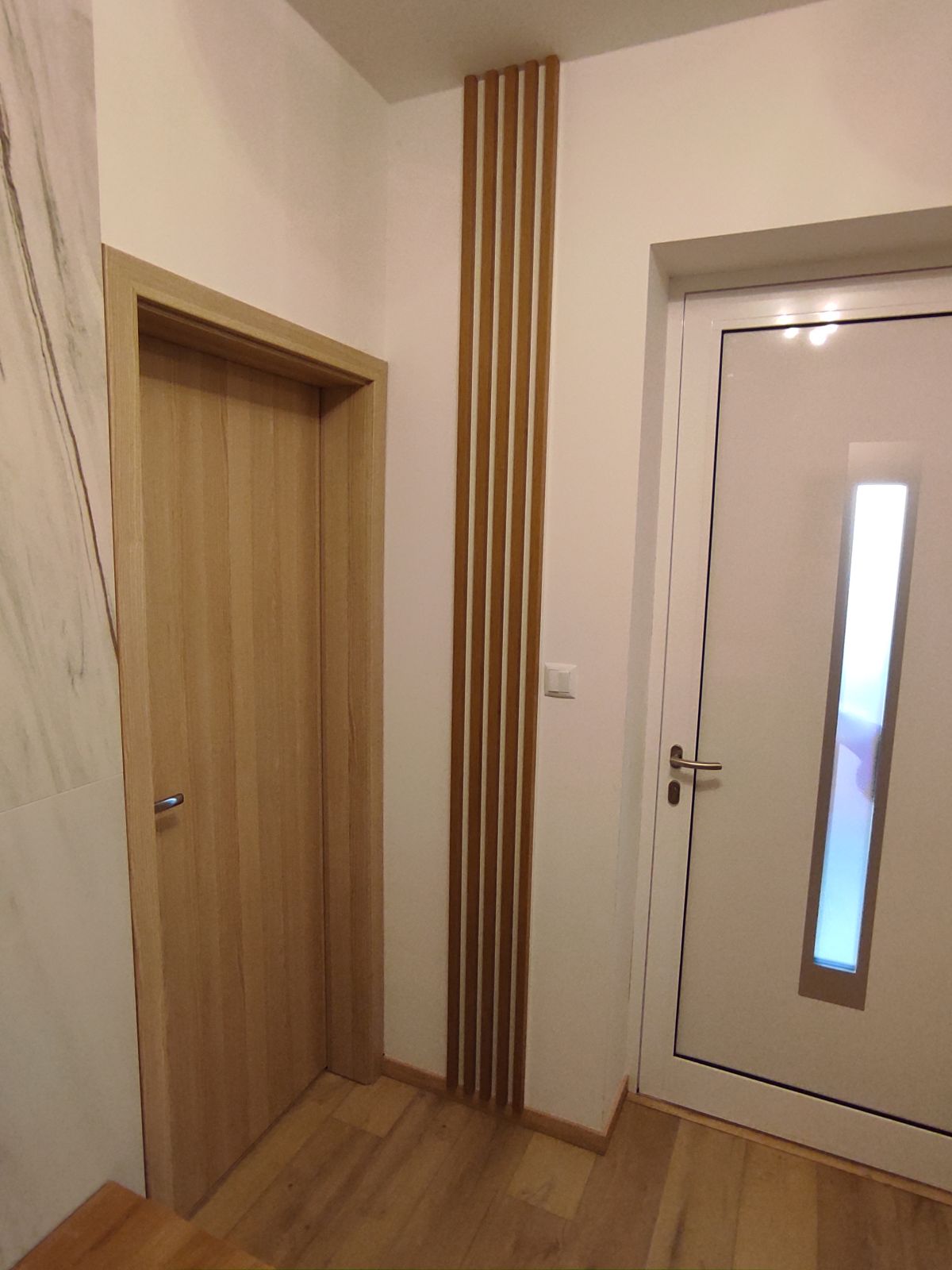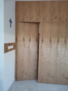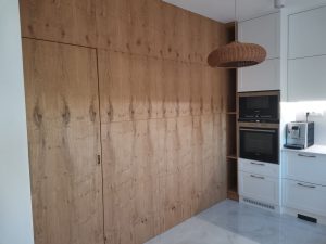 Obklad časti kuchyne, steny do komory s vstavanými dverami. Oklad bol realizovaný z dyhovaných dosiek, s dubovou dyhou vyskladanou pre danú plochu