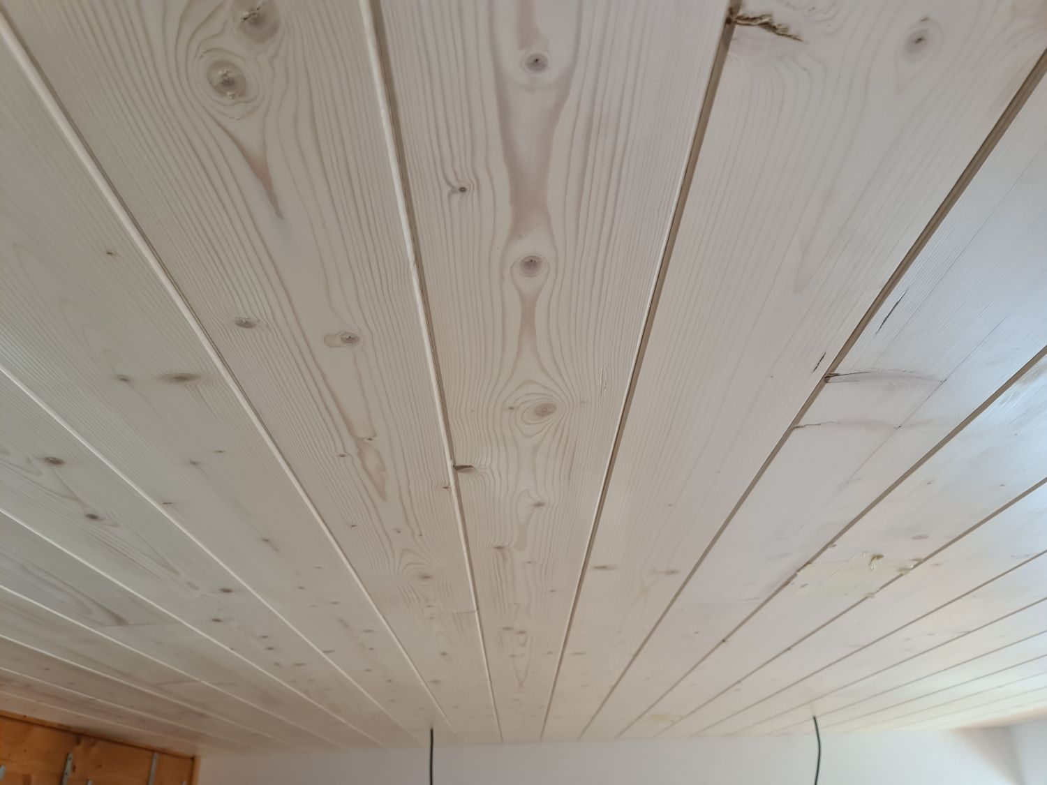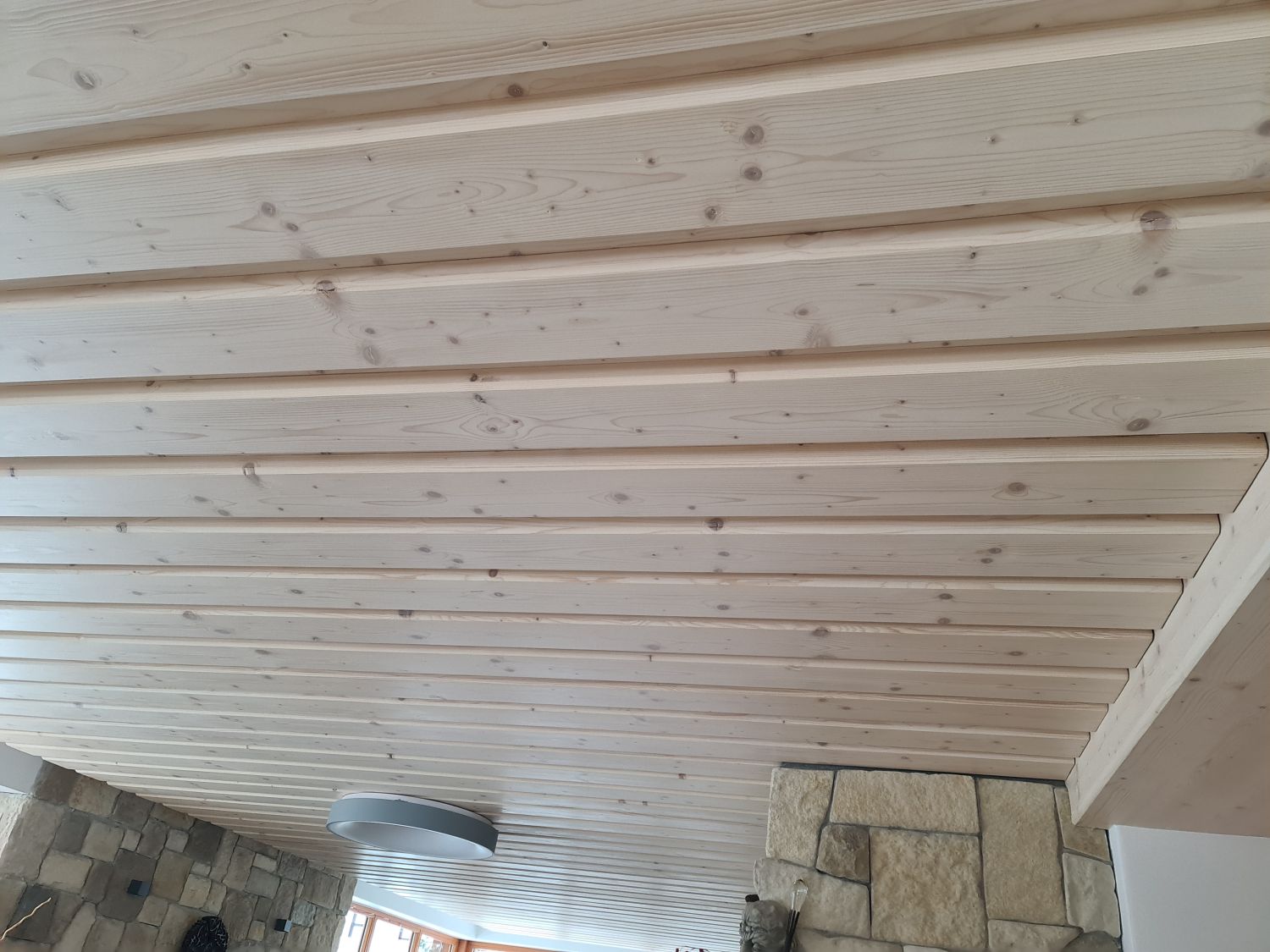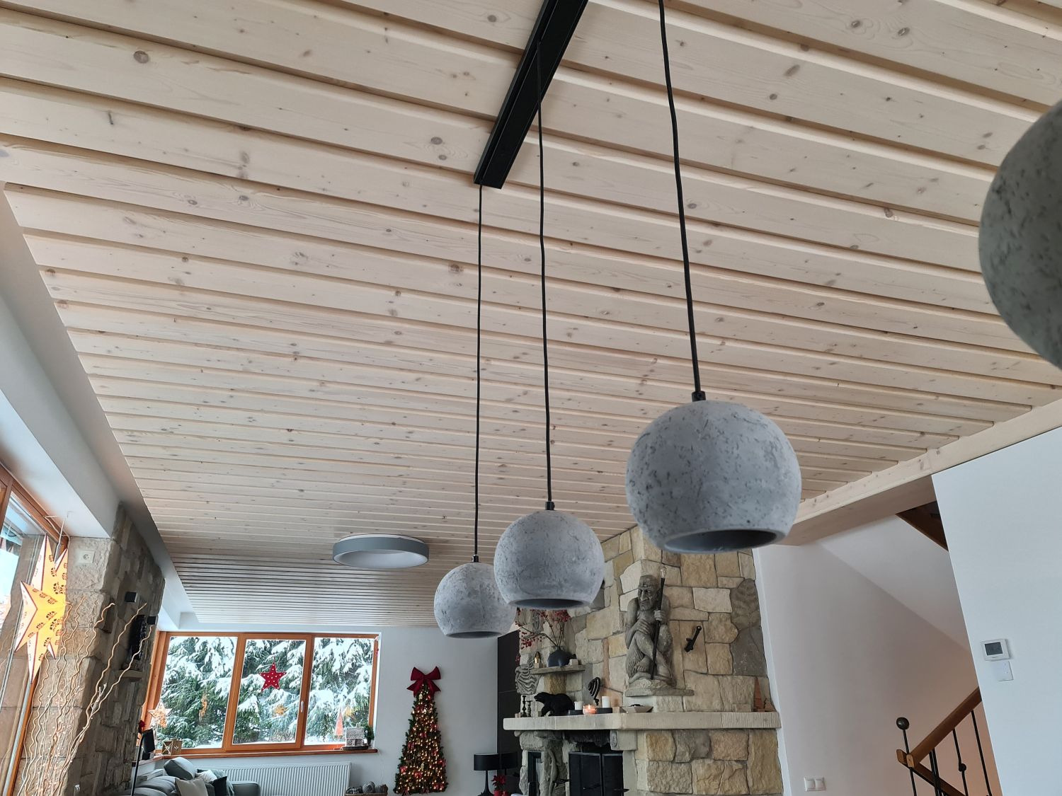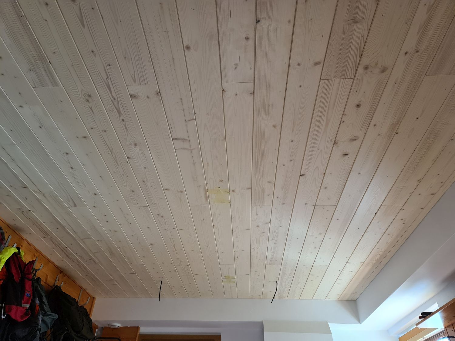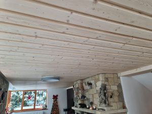 Drevený obklad stropu perodrážkovými smrekovými doskami, ošetrenými tónovaným olejom pre pomalšie starnutie. So zabudovaným led pásom