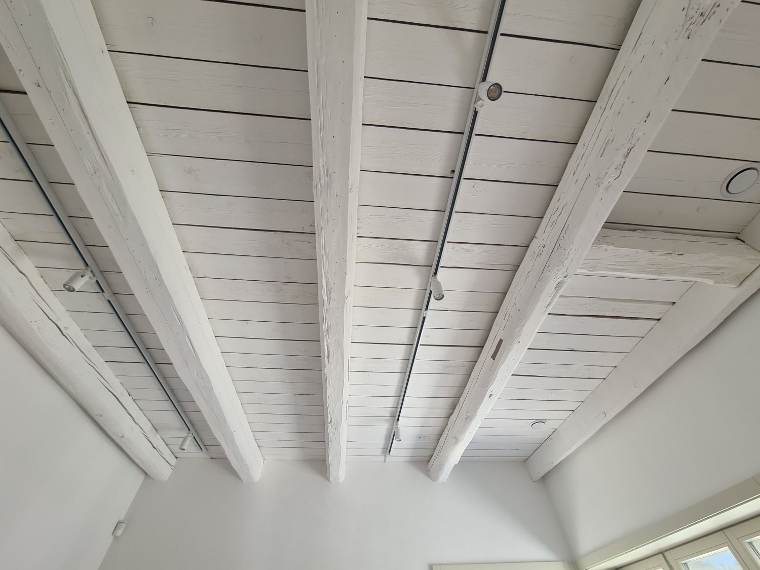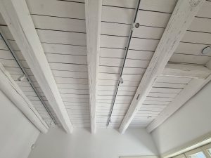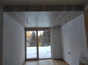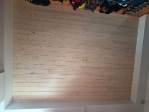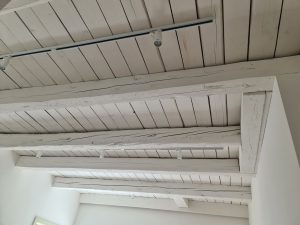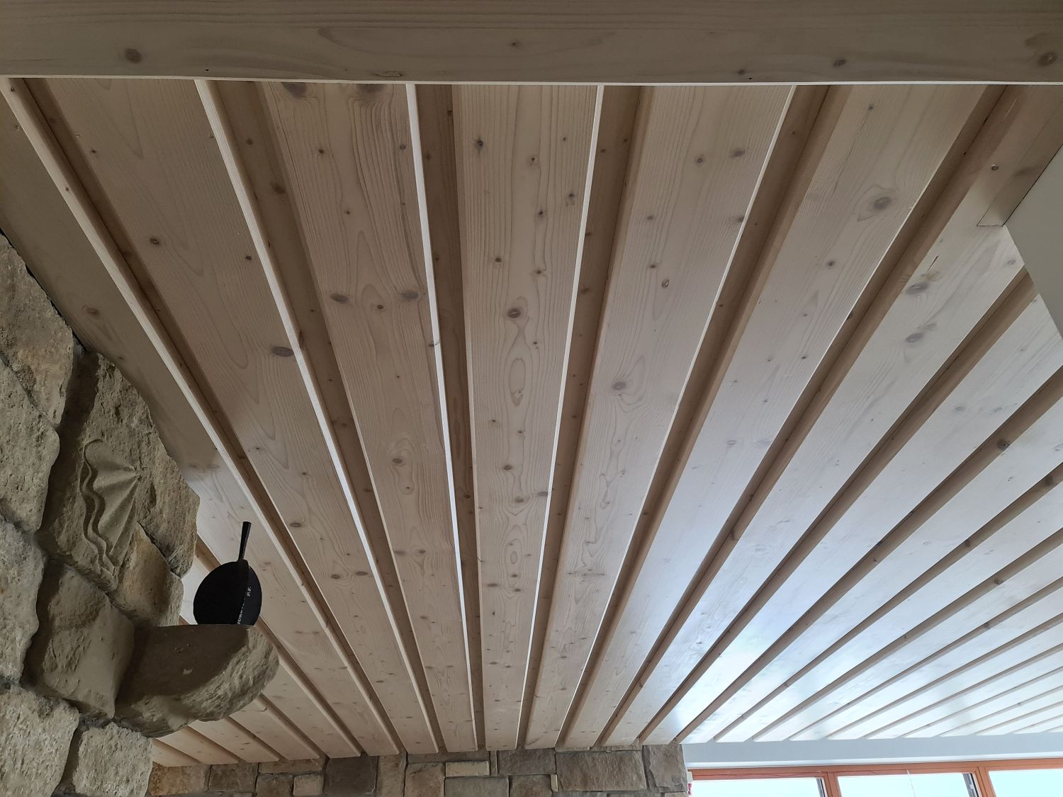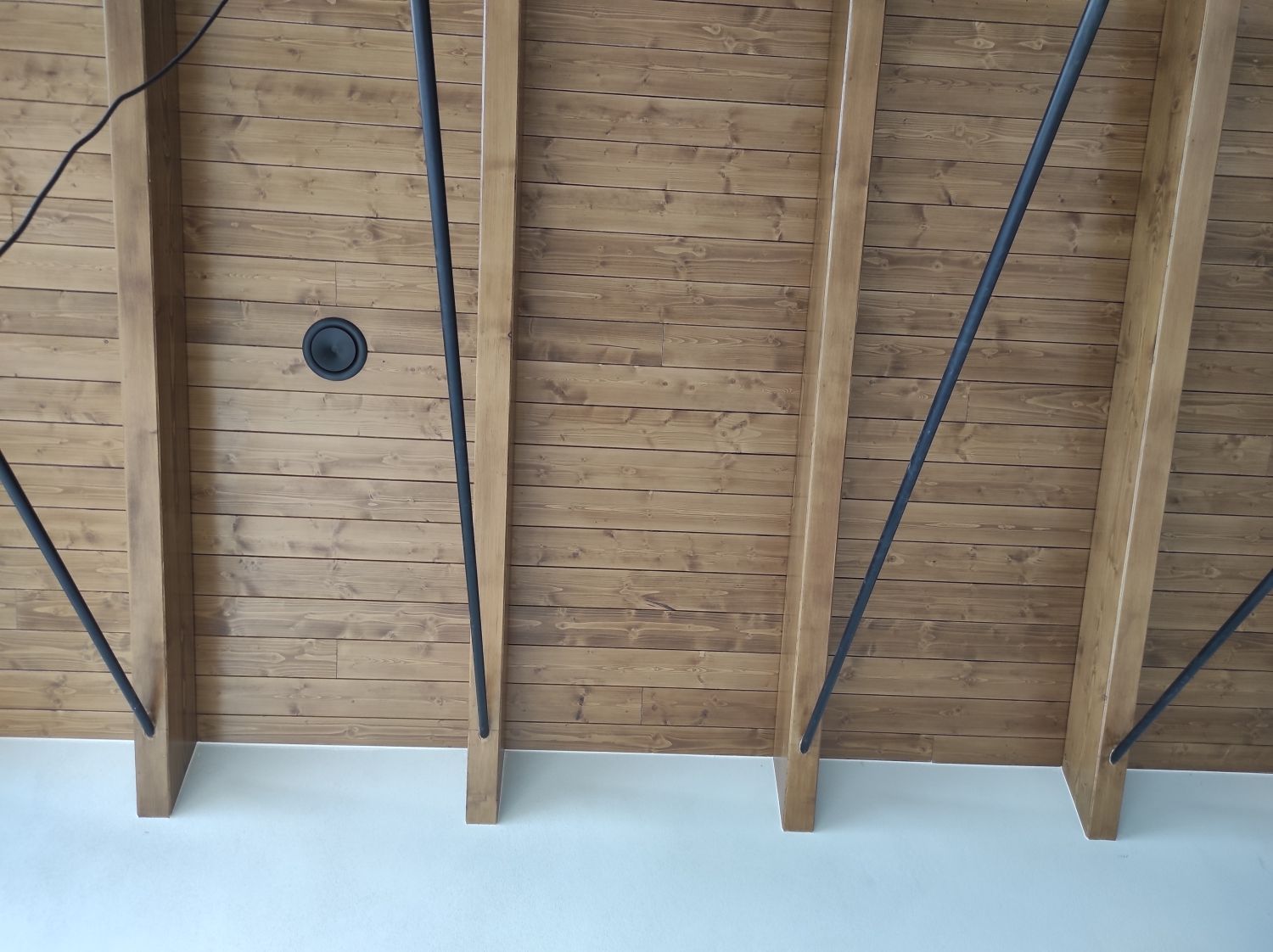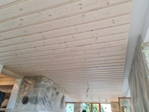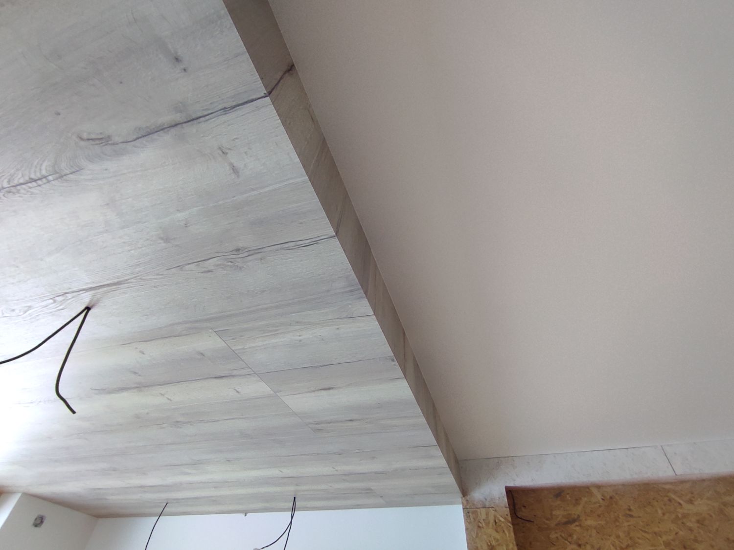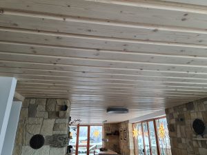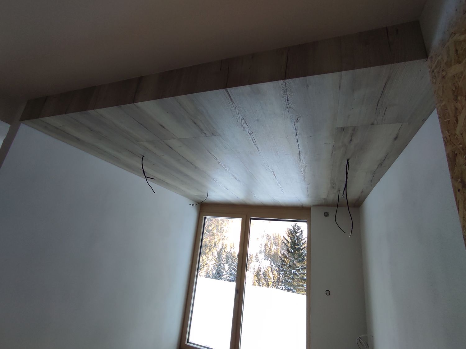 Drevený obklad stropu perodrážkovými smrekovými doskami, ošetrenými tónovaným olejom pre pomalšie starnutie. So zabudovaným led pásom