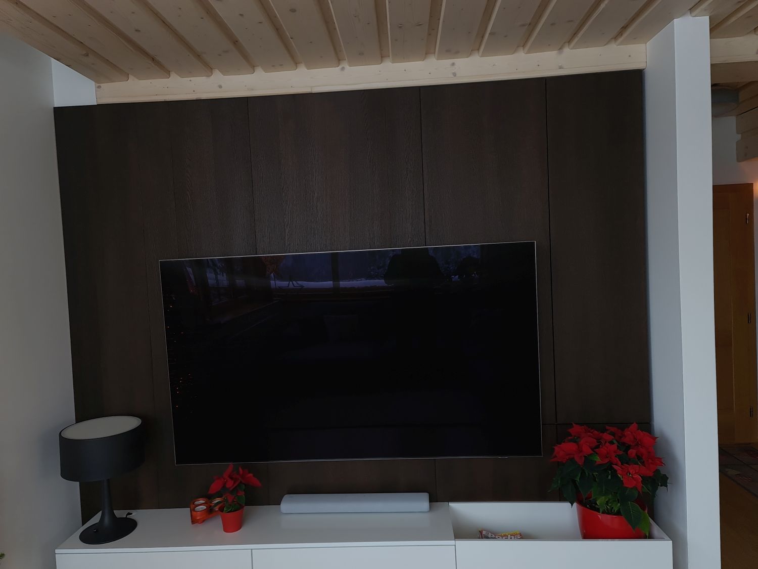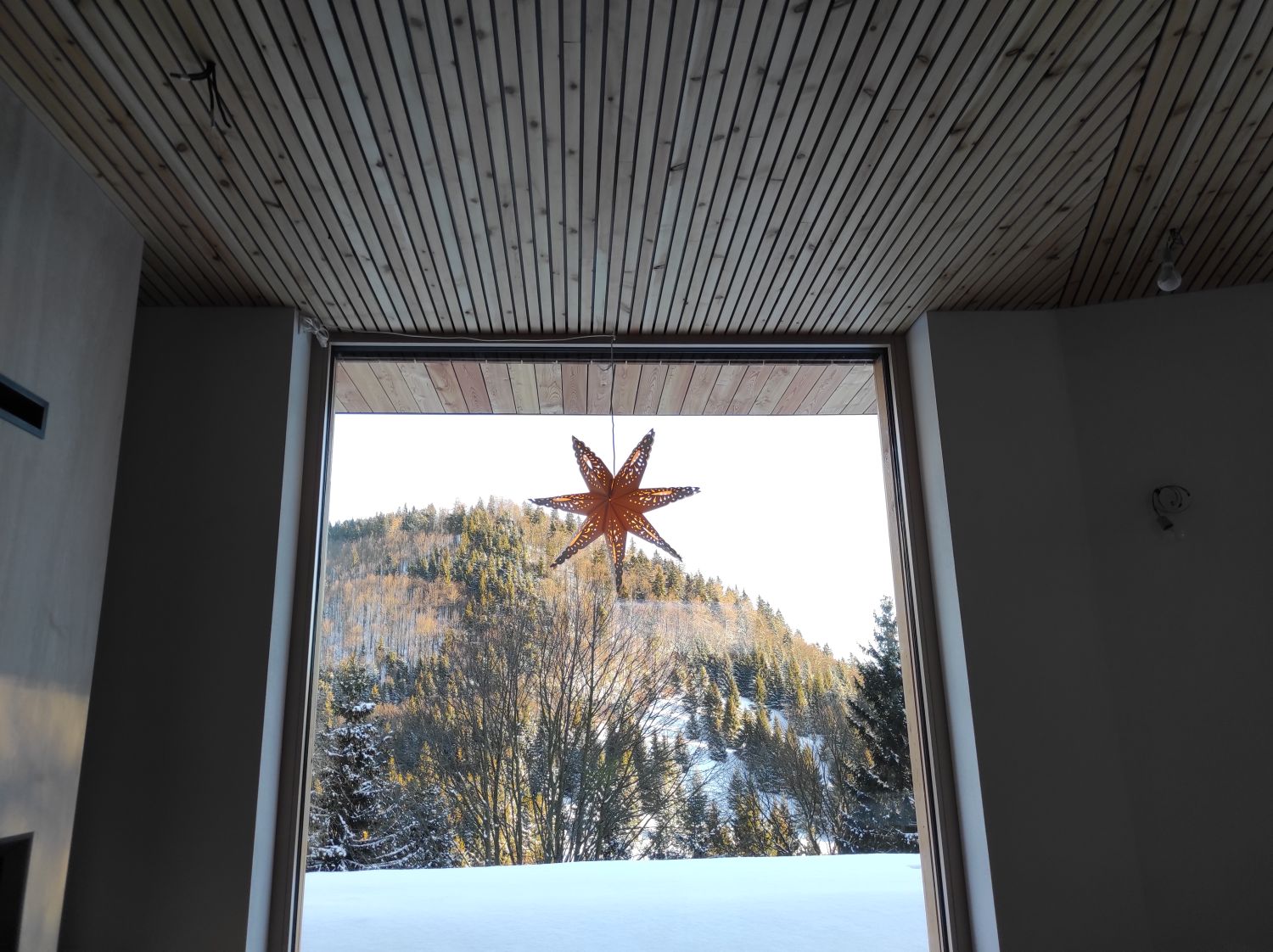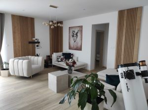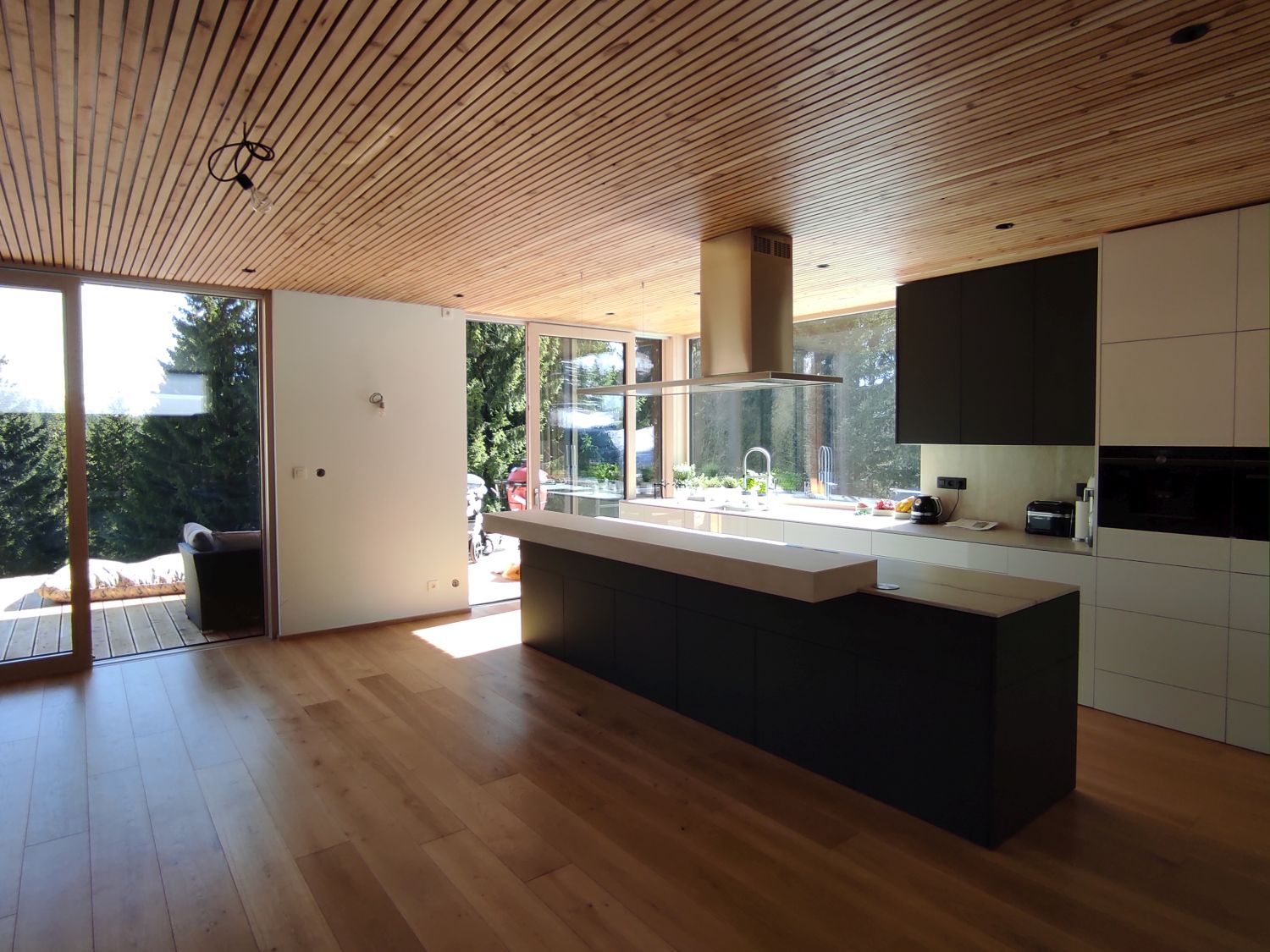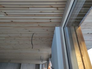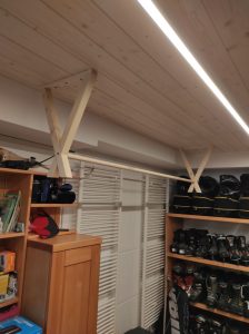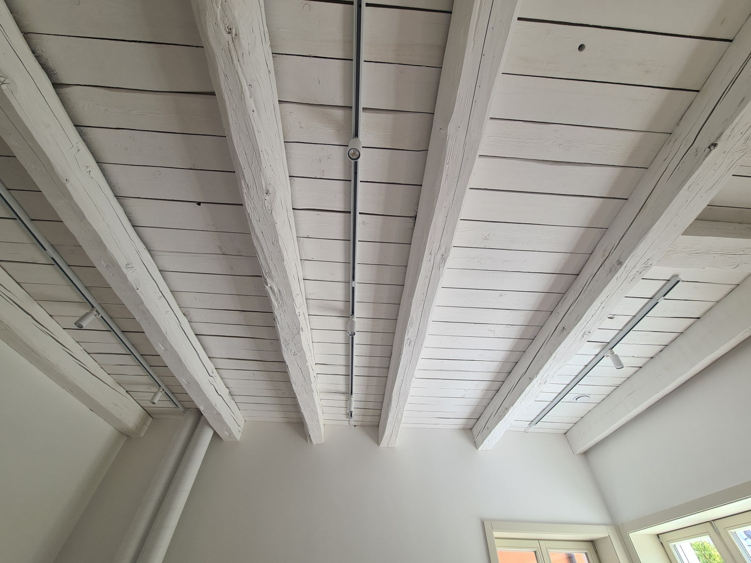 Drevený obklad stropu perodrážkovými smrekovými doskami, ošetrenými tónovaným olejom pre pomalšie starnutie. So zabudovaným led pásom