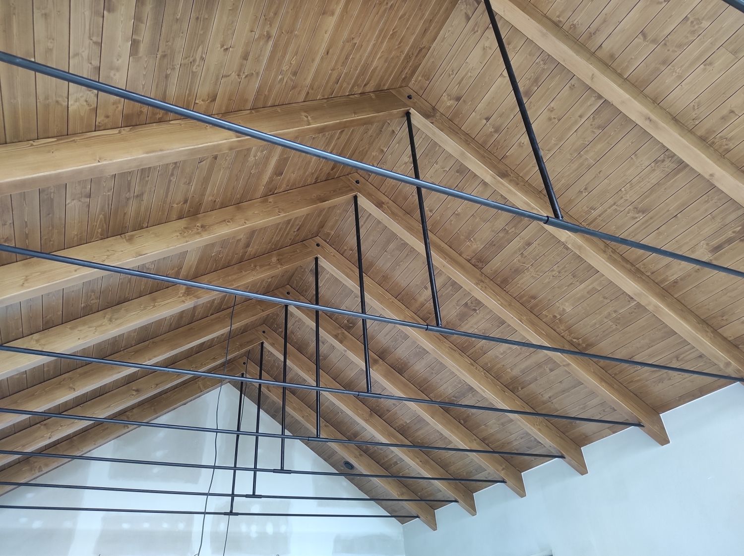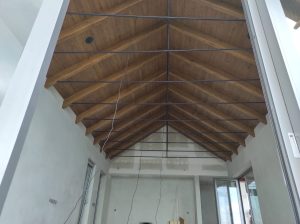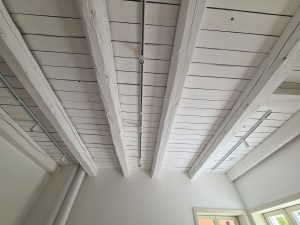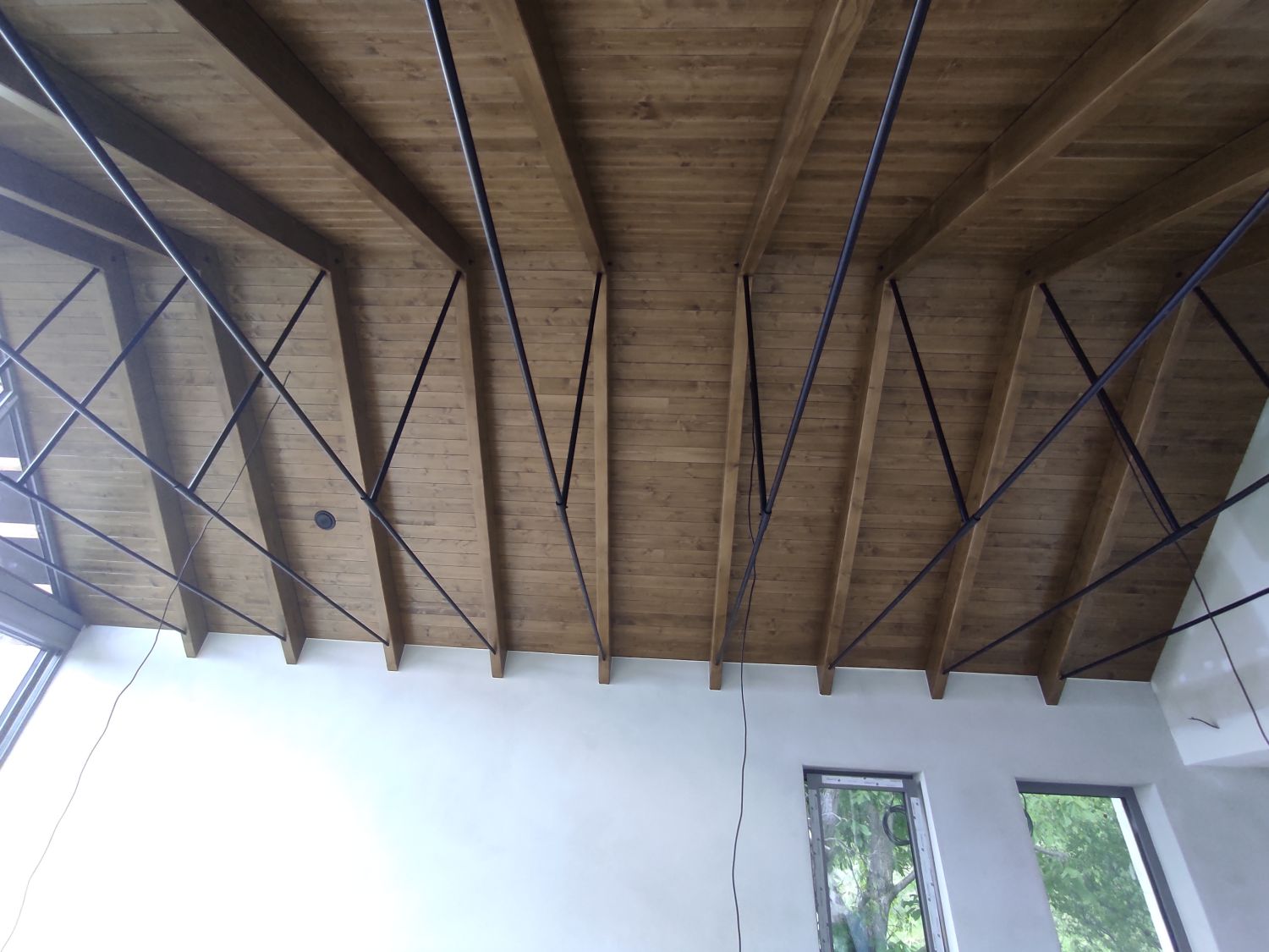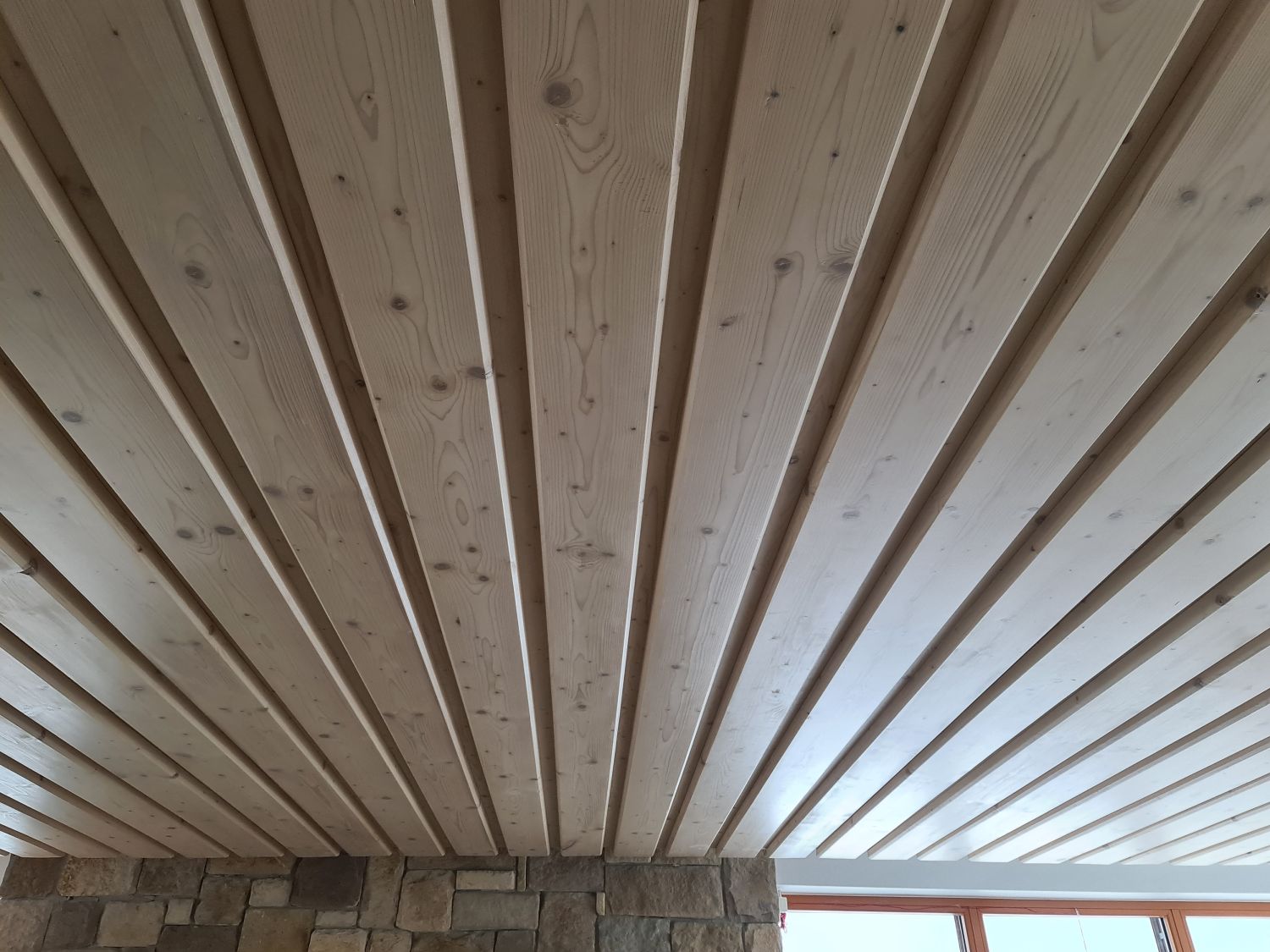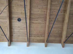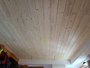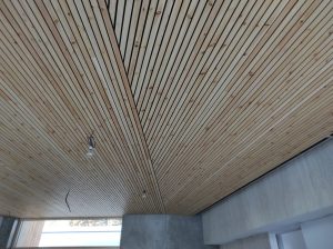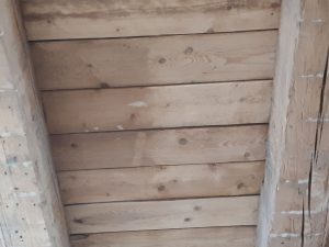 Drevený obklad stropu s priznanými šikmými plochami strechy a tiahlami. Obklad stropu bol realizovaný smrekovými perodrážkovými doskami ošetrenými interiérovou lazúrou. Na obklad boli montované dekoratívne drevené falošné trámy