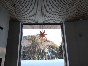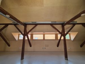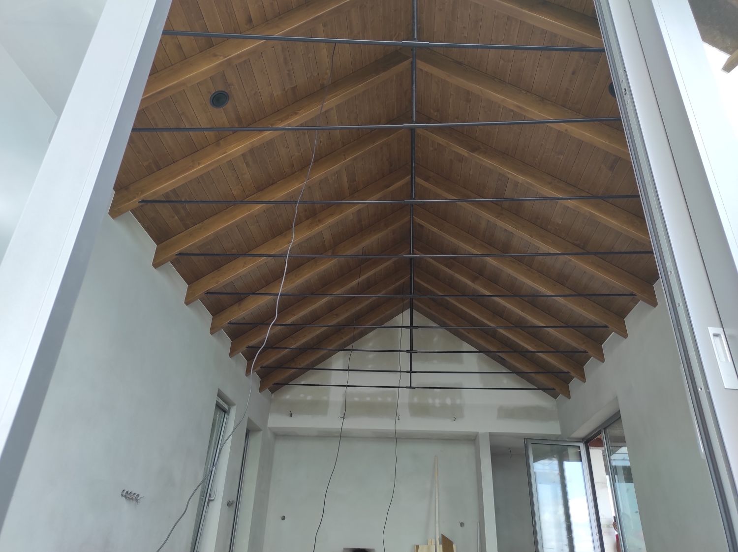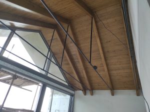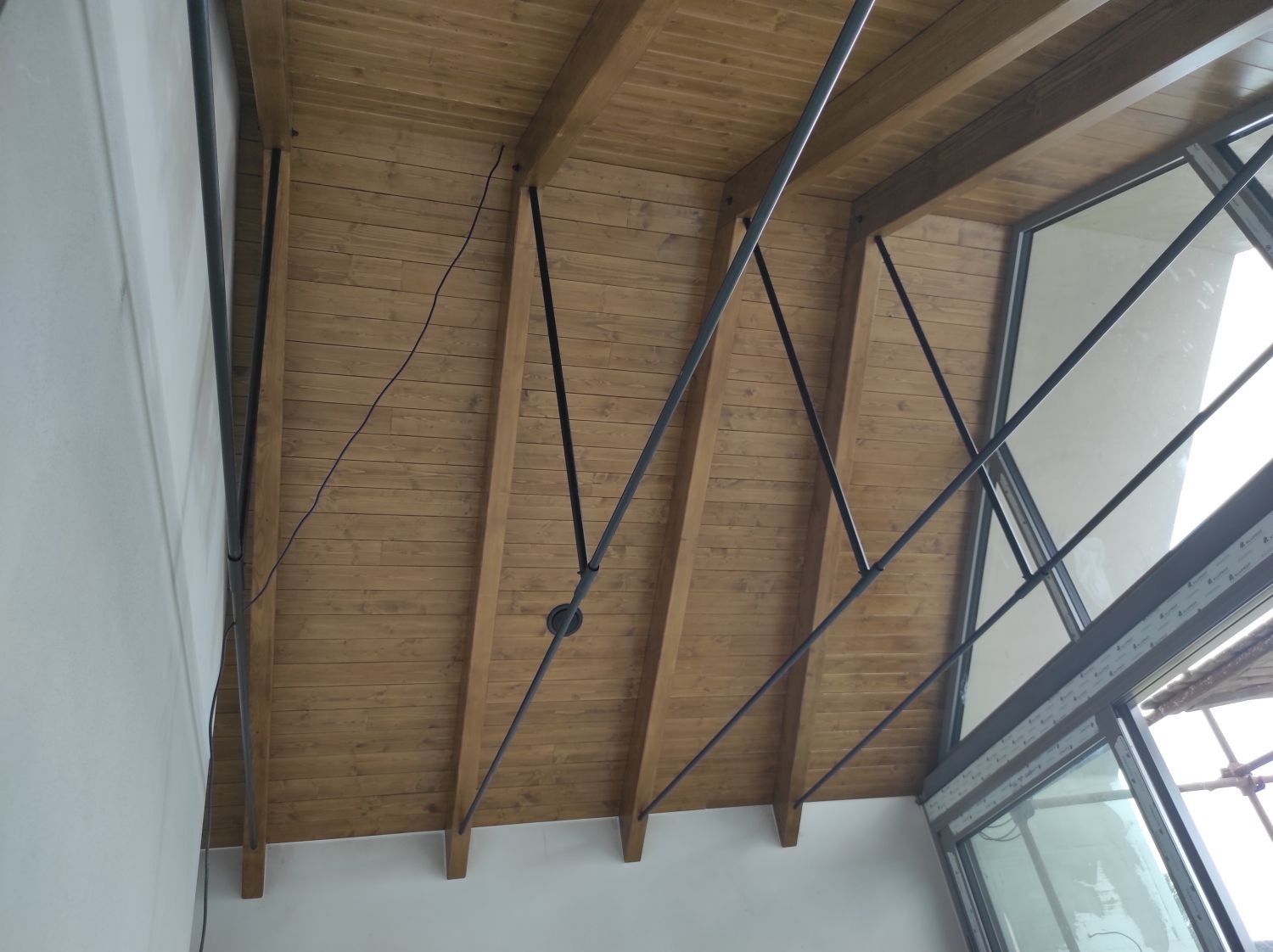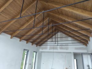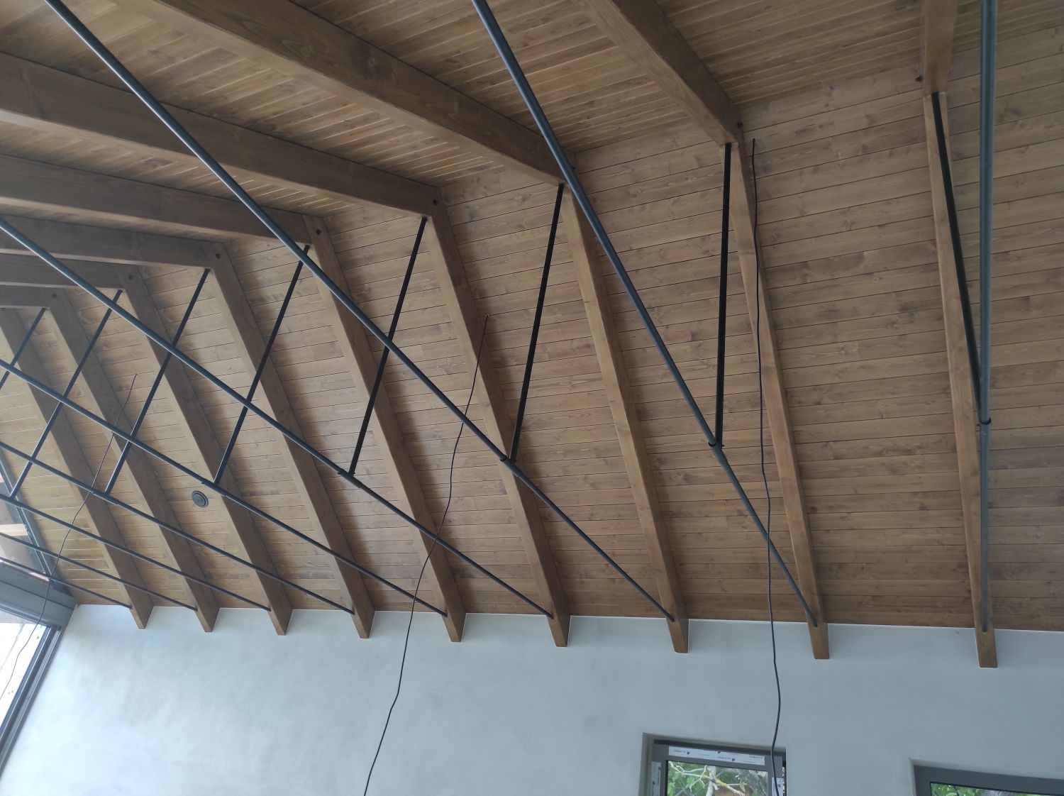 Drevený obklad stropu s priznanými šikmými plochami strechy a tiahlami. Obklad stropu bol realizovaný smrekovými perodrážkovými doskami ošetrenými interiérovou lazúrou. Na obklad boli montované dekoratívne drevené falošné trámy