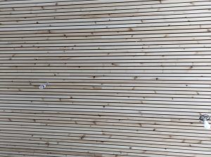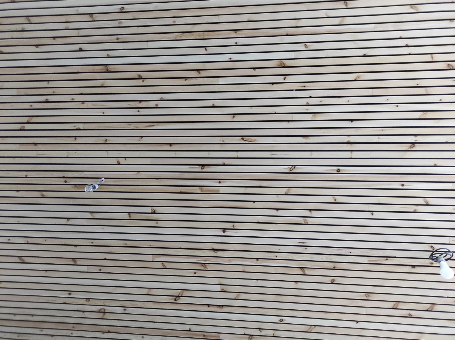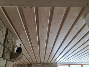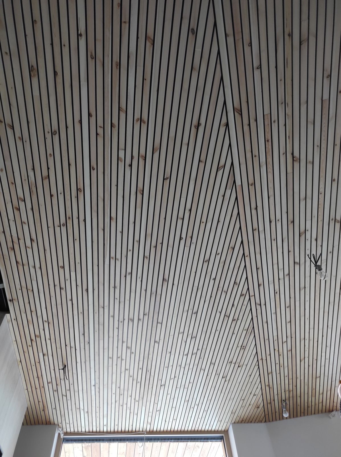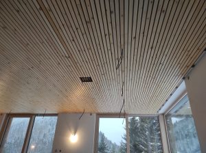 Drevený hranolčekový obklad stropu z drevených hranolčekov zo severského smreku a borovice, s čiernymi perkami v medzerách