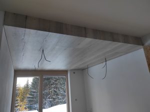 Imitácia prekladaného dreveného stropu zo smrekových fošní a dosiek, ošetrenými tónovaným olejom pre pomalšie starnutie