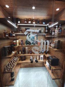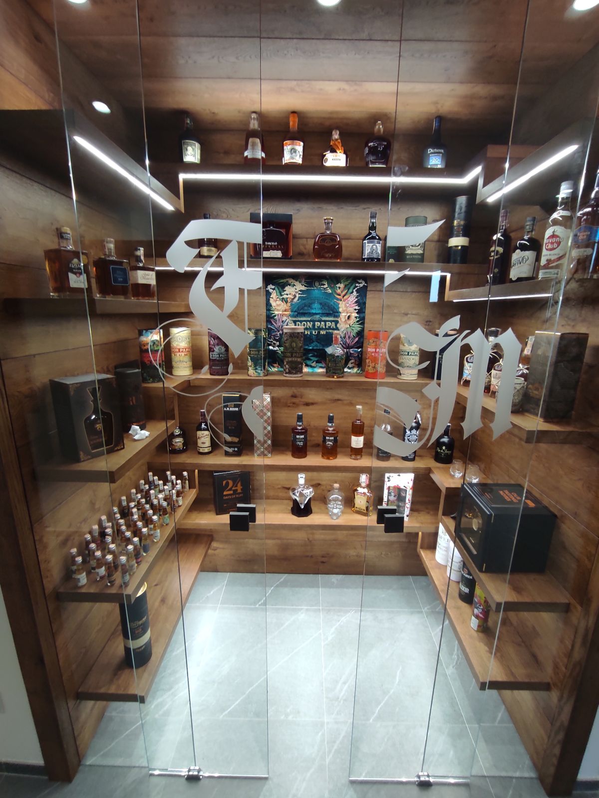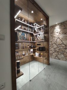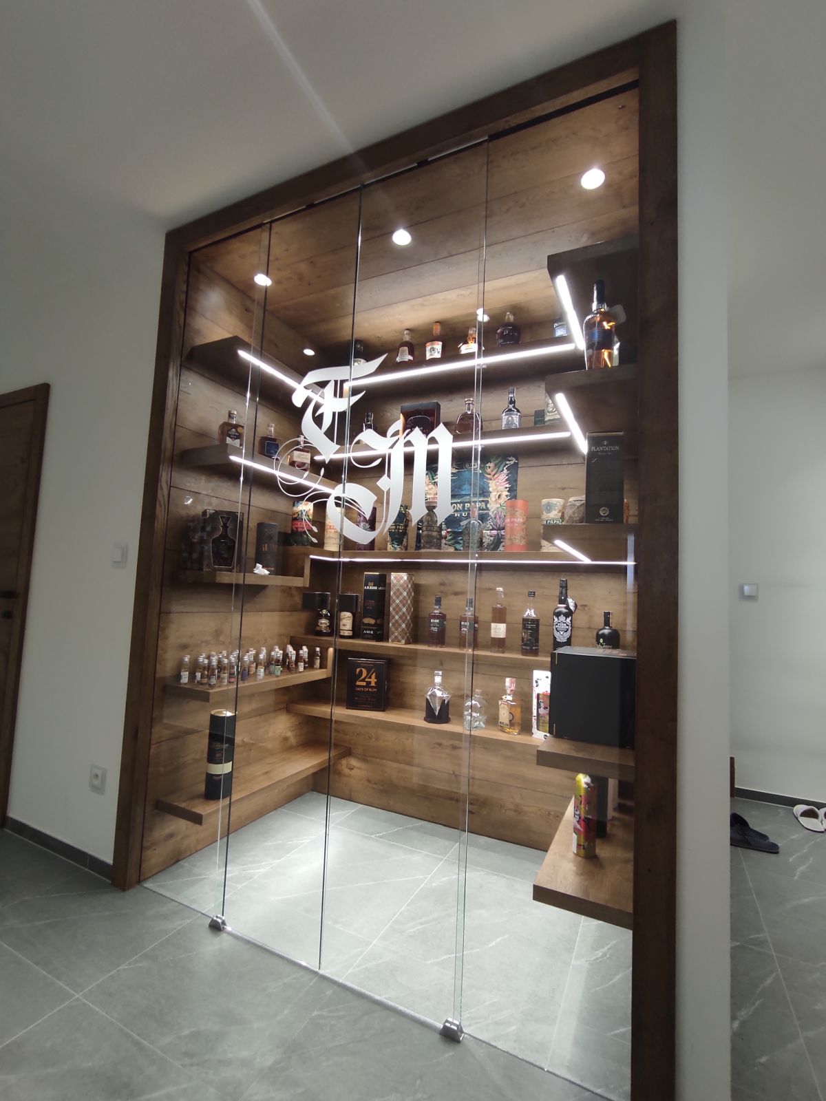 Vitrína s obkladom stien doskami s dubovou dyhou, policami podsvietenými led pásmy, a sklenými odsuvnými dverami s gravírovaným vzorom podľa predlohy