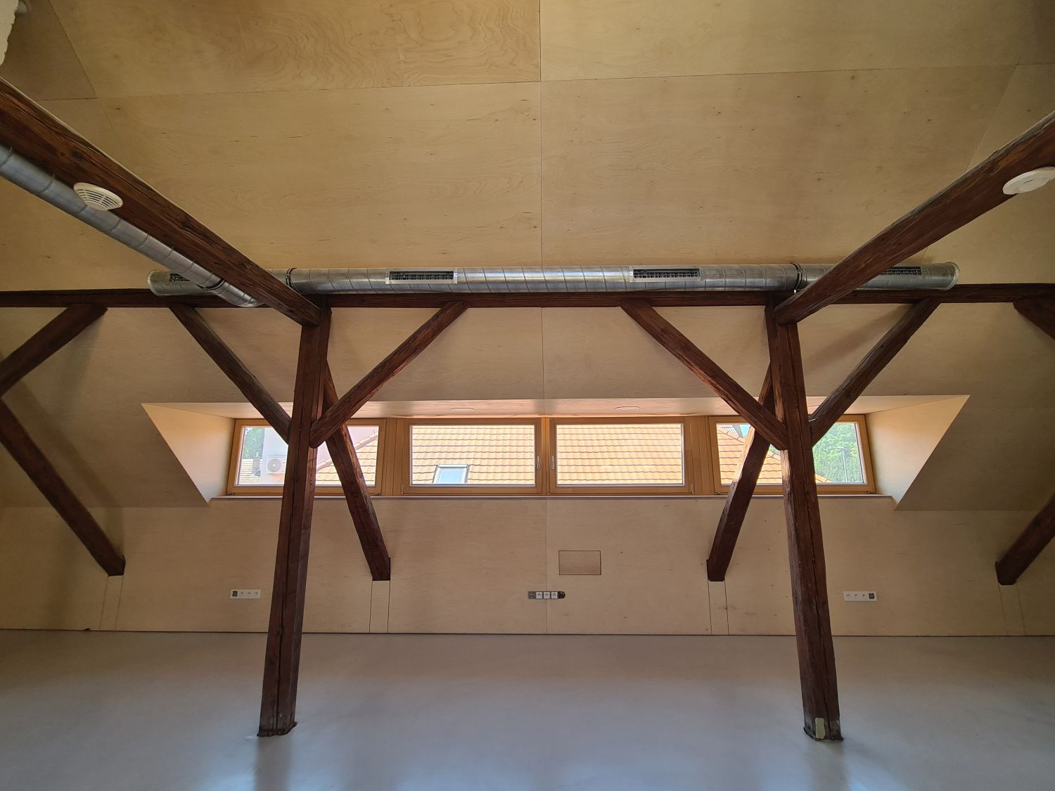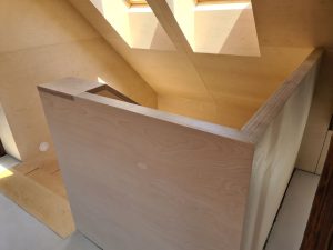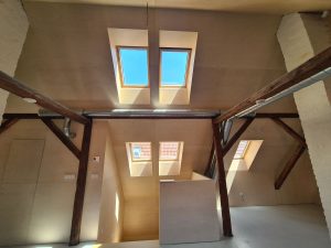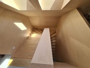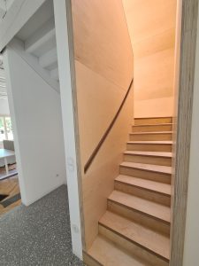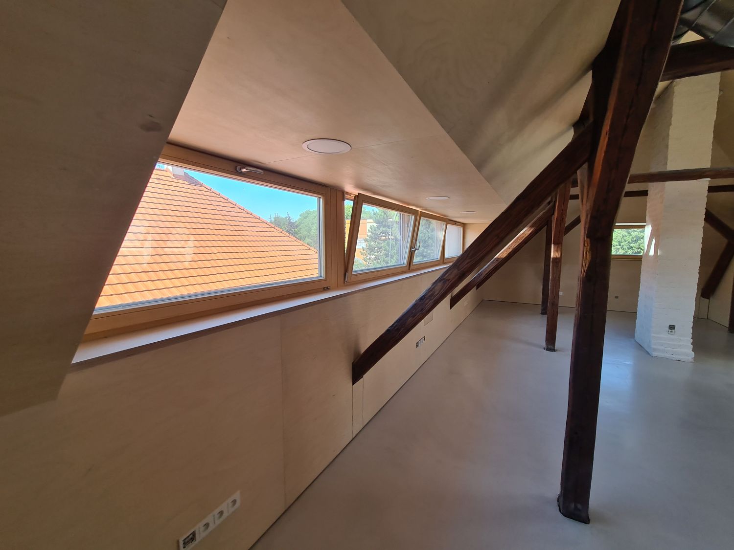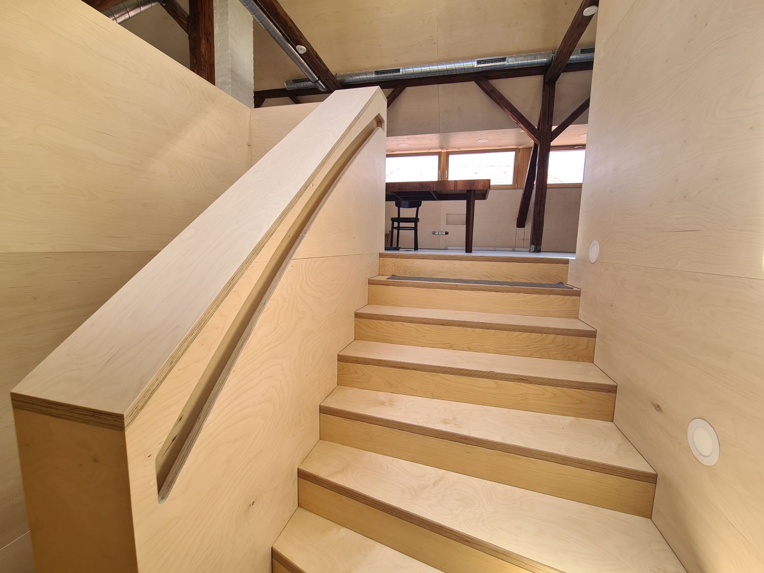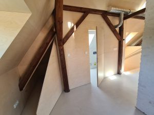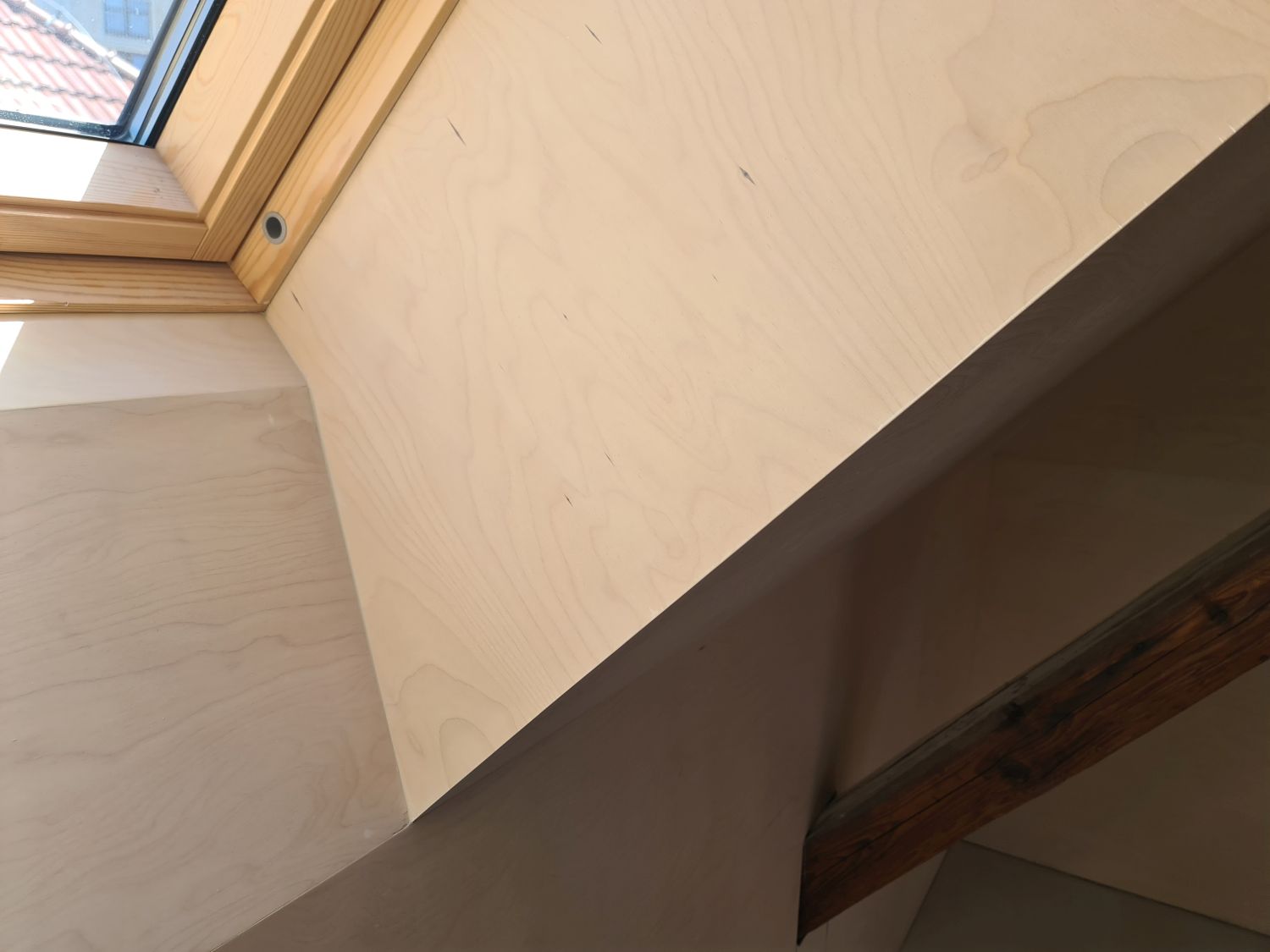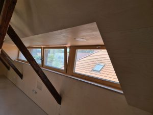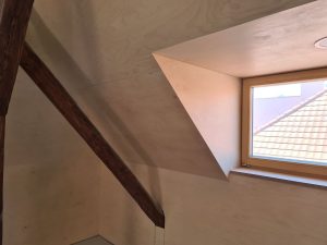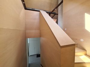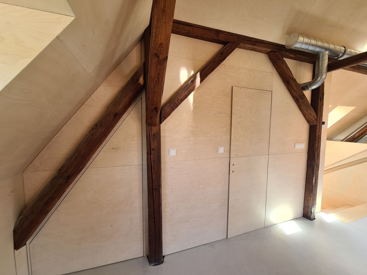 Drevený doskový obklad schodiskového priestoru a podkorovia preglejkovými doskami. V priestore podkrovia s priznanými pôvodnými prvkami očistenými a ošetrenými interiérovým olejom s voskom