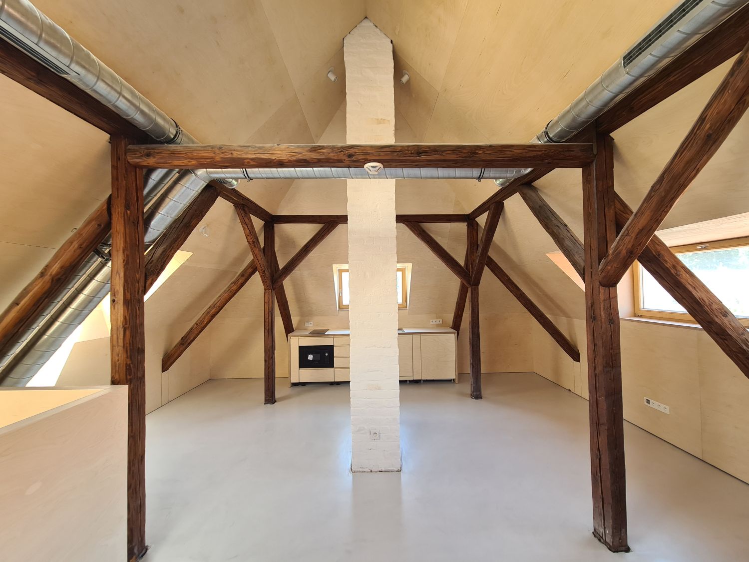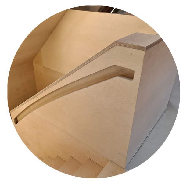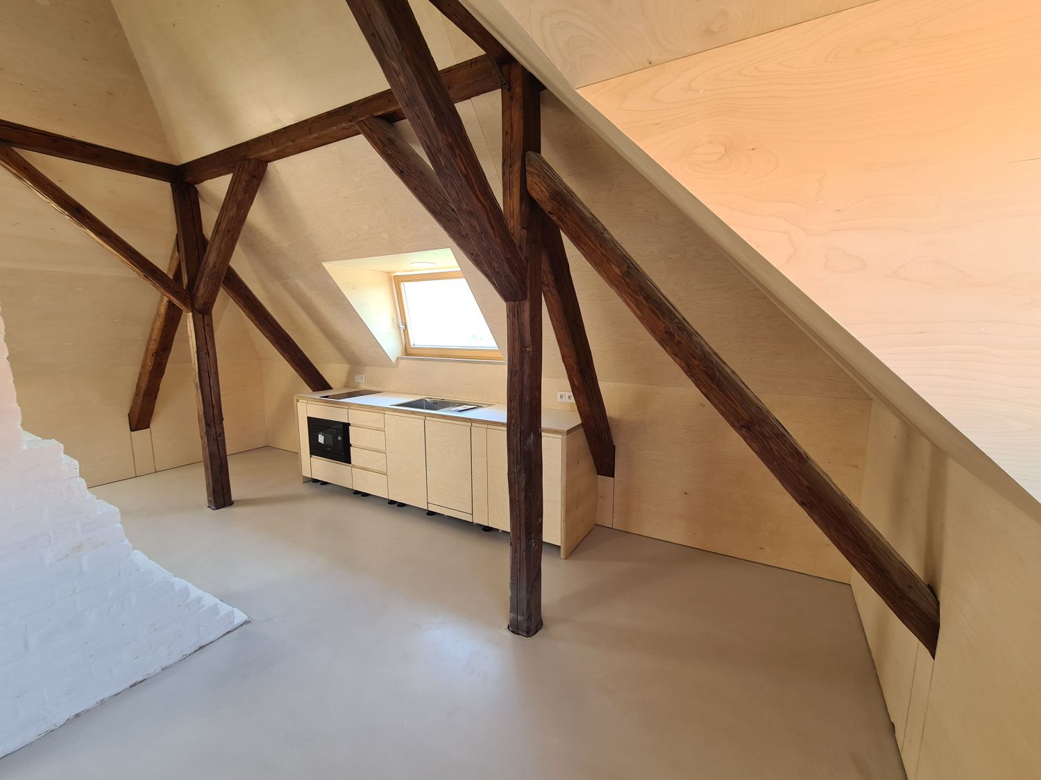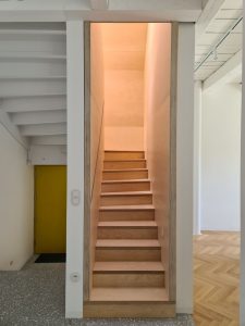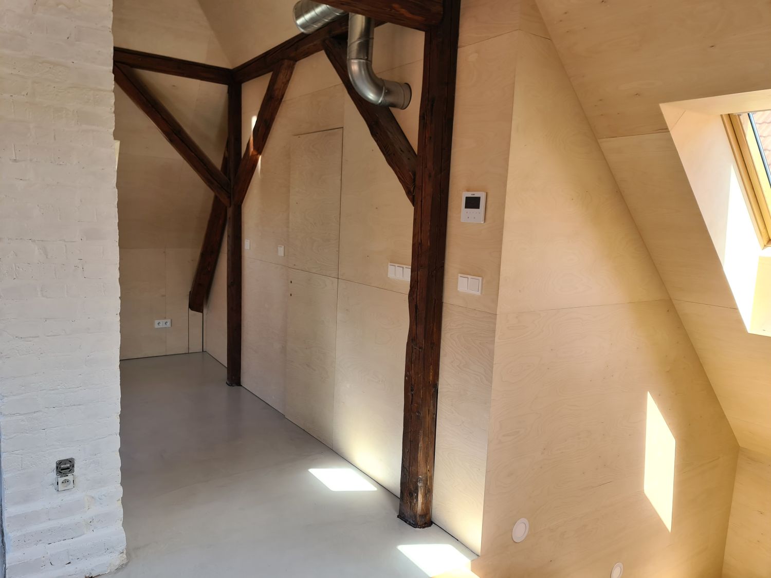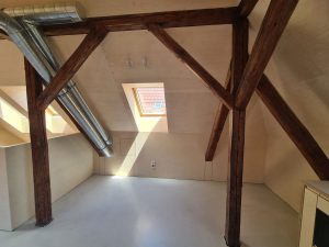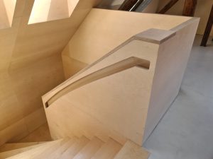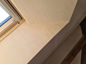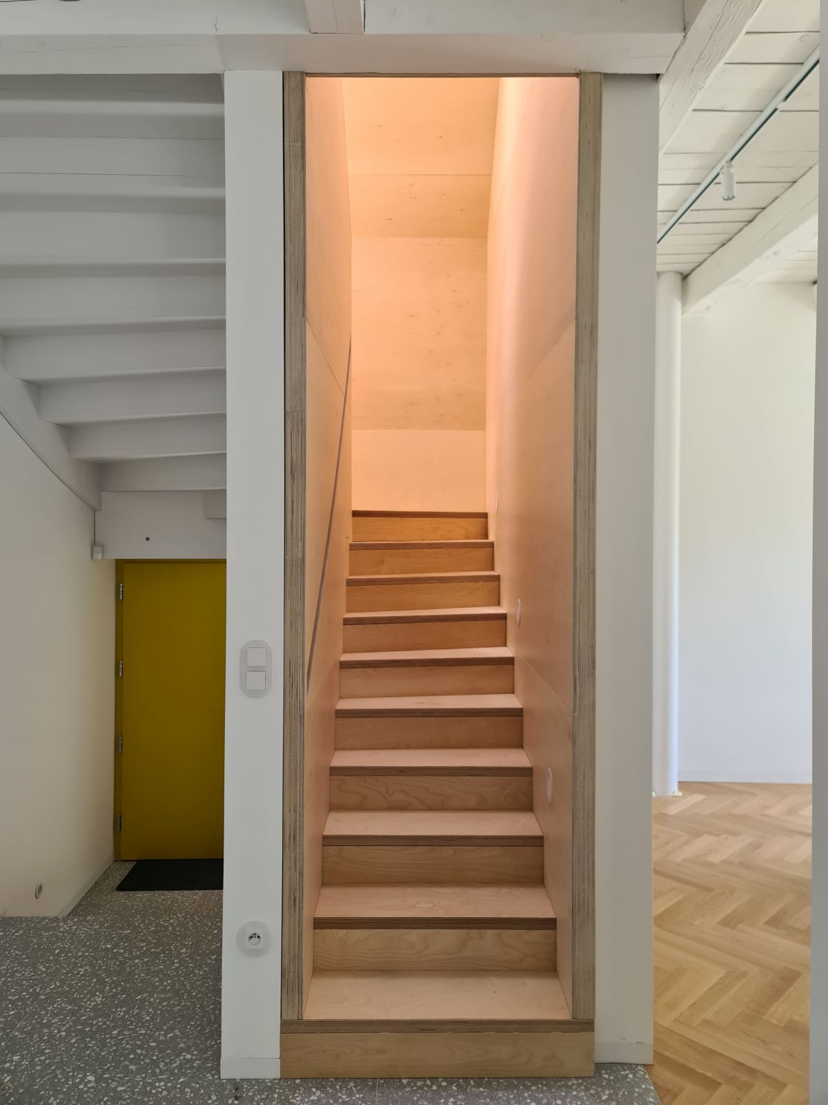 Drevený doskový obklad schodiskového priestoru a podkorovia preglejkovými doskami. V priestore podkrovia s priznanými pôvodnými prvkami očistenými a ošetrenými interiérovým olejom s voskom