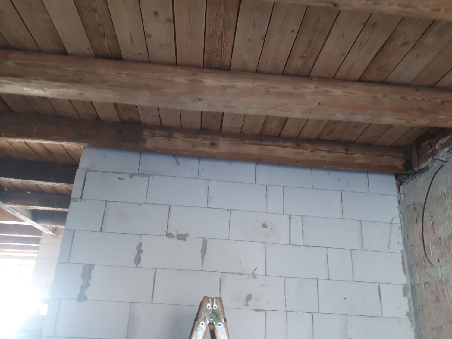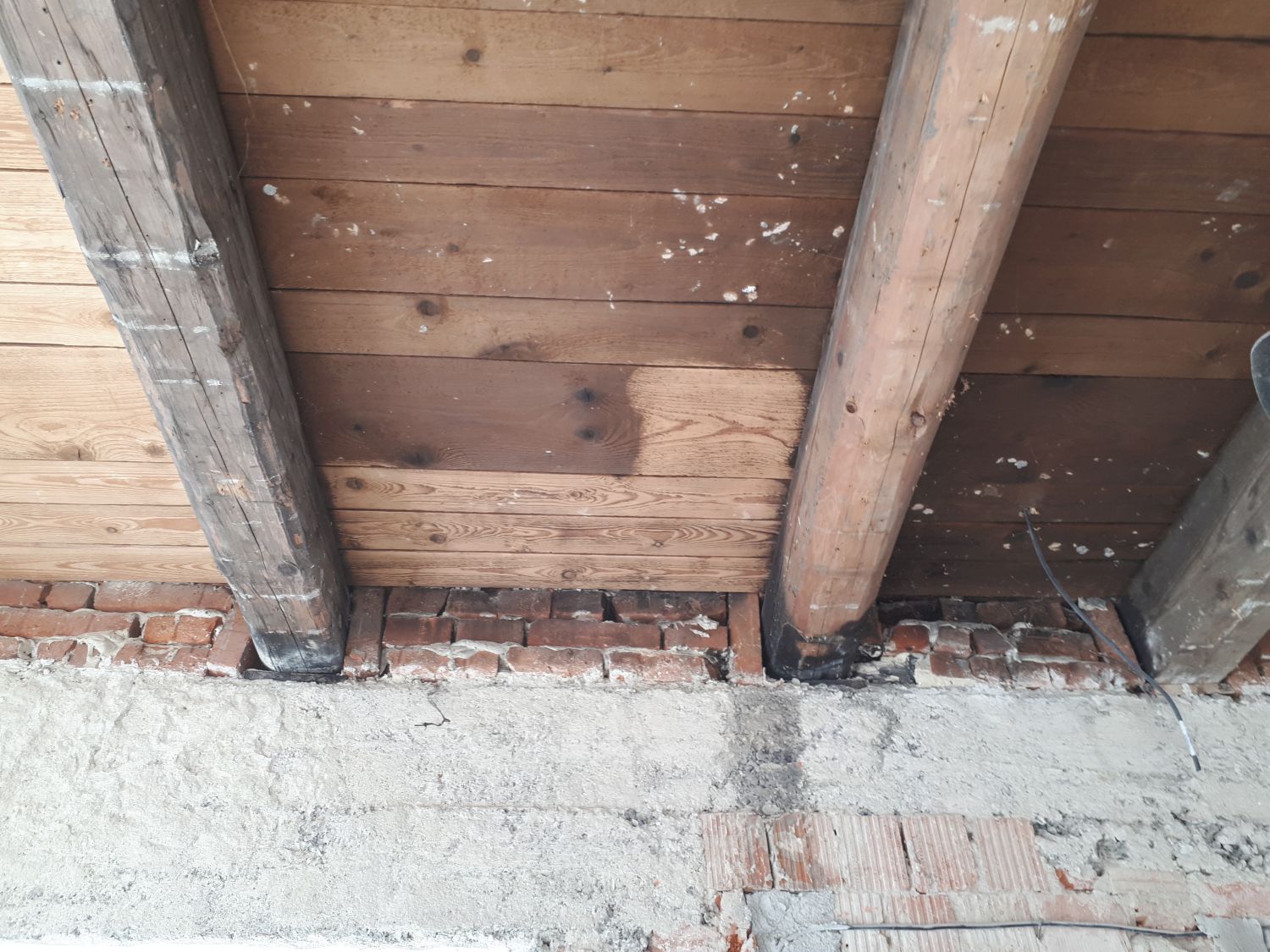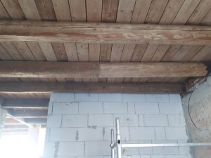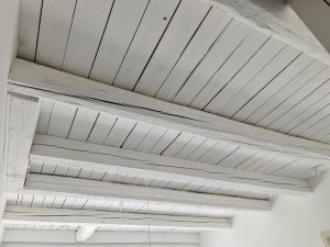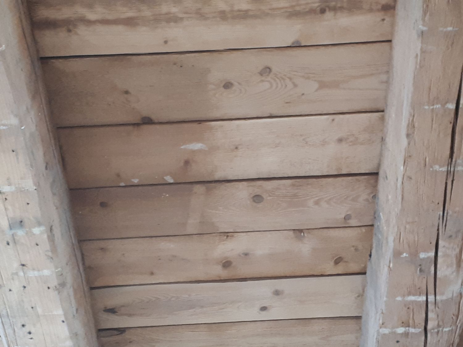 Renovácia dreveného stropu mechanicky brúsením a kartáčovaním ako príprava pre budúce ošetrenie farebnou povrchovou úpravou